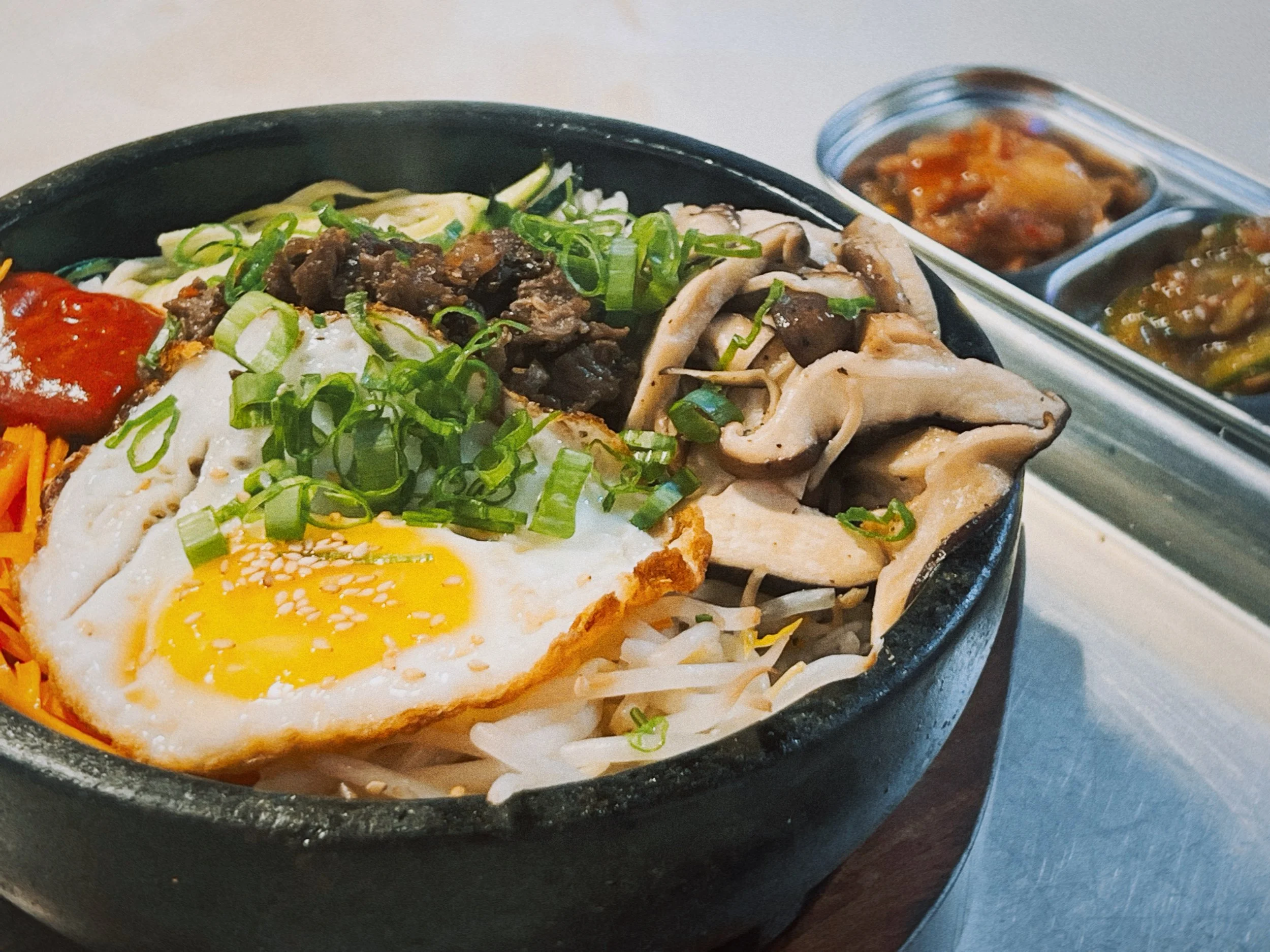 choice of protein-bulgogi-pork belly-chicken-tofu rice, shiitake mushrooms, zucchini, carrots, bean sprouts, fried egg, and topped with roasted seaweed. served in a dolsot stone bowl (for here orders only) with special sauce and banchan [side dishes]