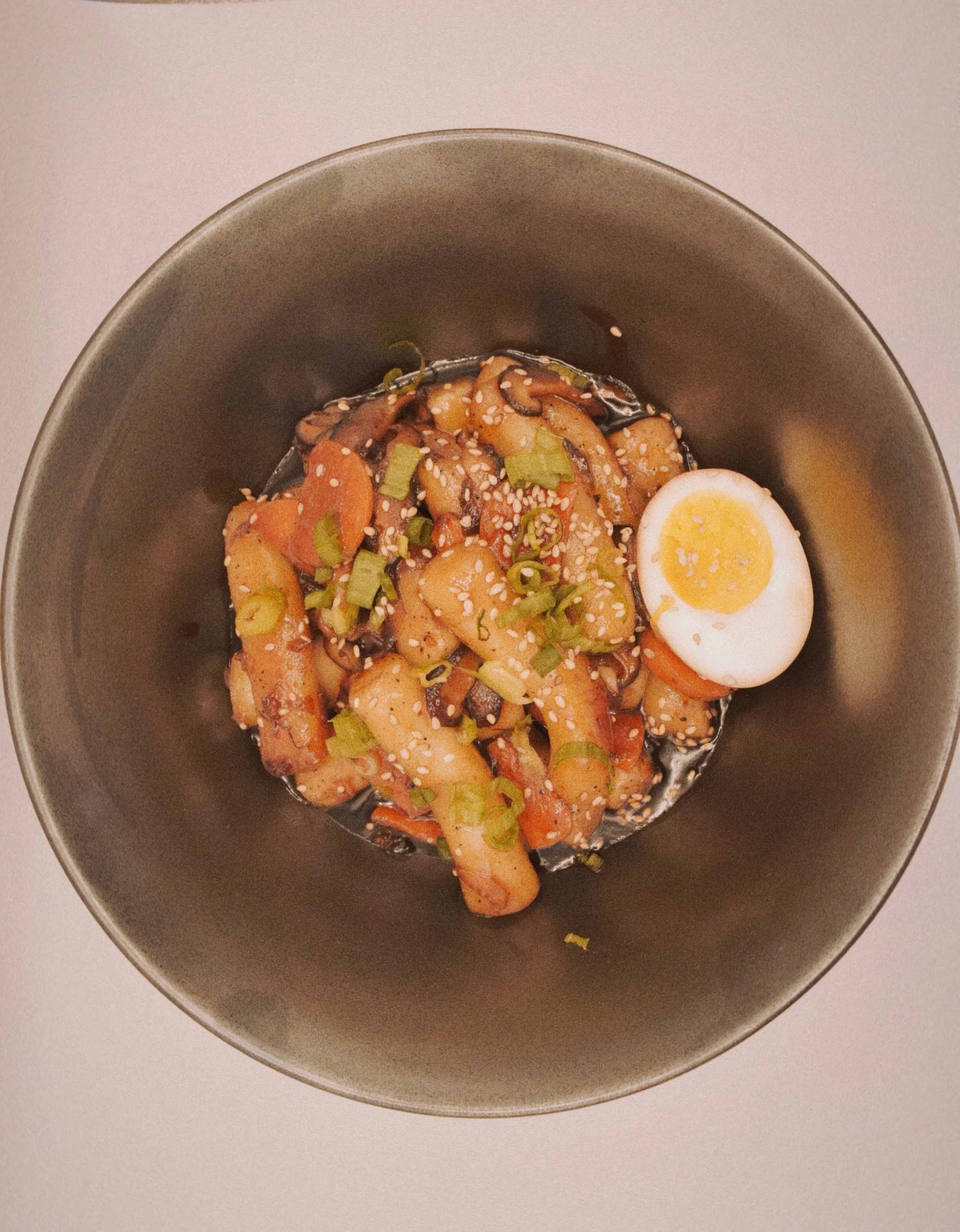 stir-fried rice cakes in a spicy sauce, with carrots, shiitake mushrooms, topped with a marinated boiled egg garnished with green onion and sesame seeds