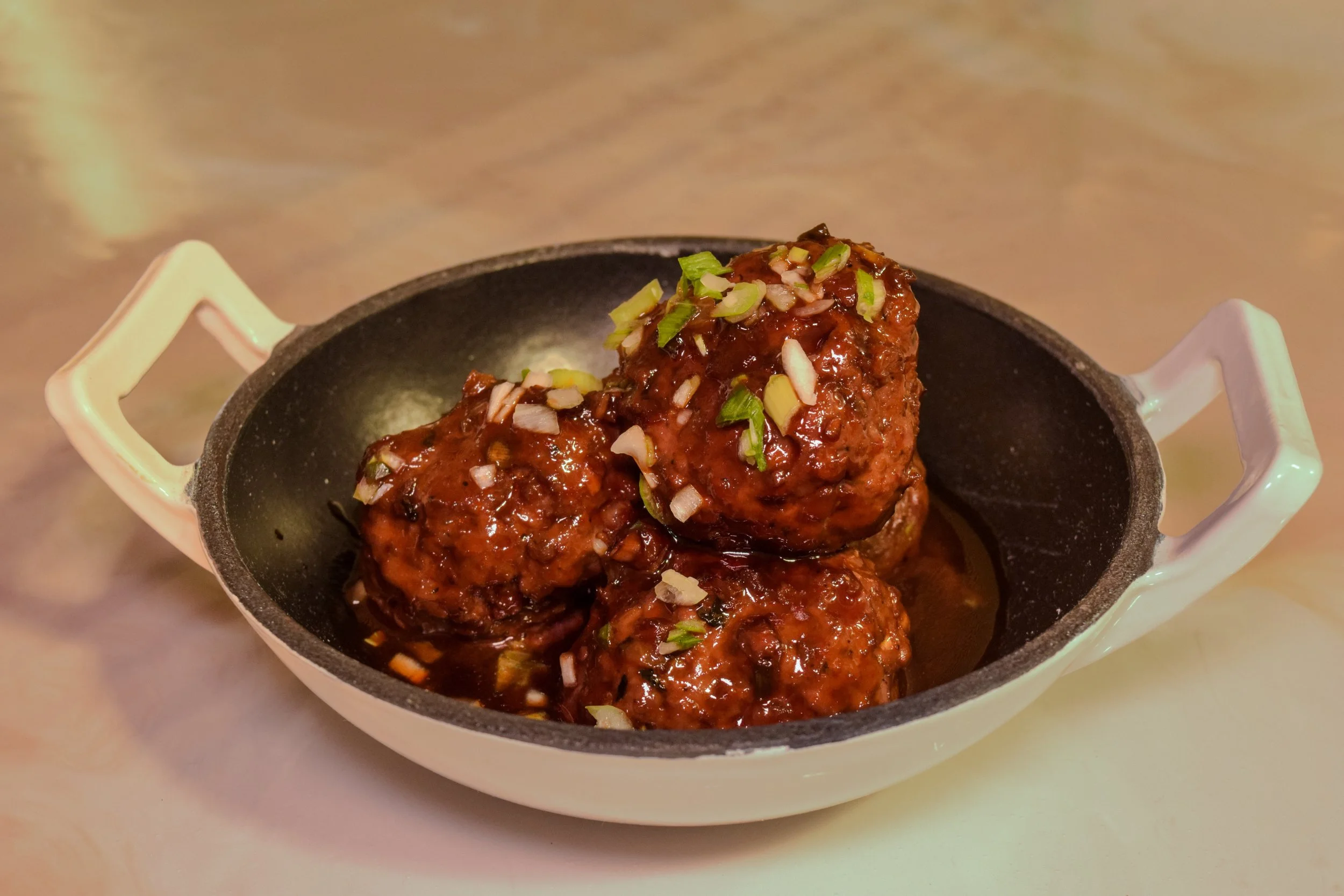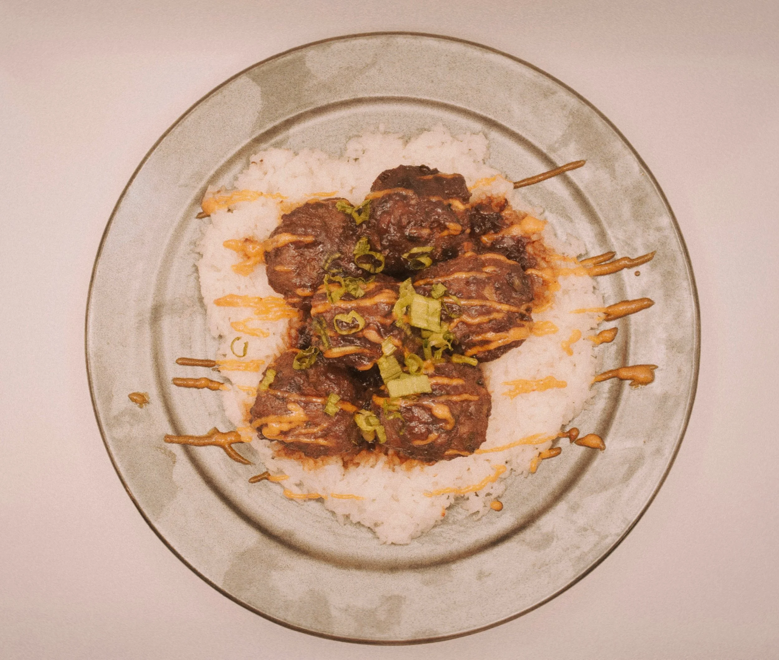 beef meatballs, glazed in a sticky korean bbq sauce on a bed of rice, drizzled with mayo-korean sauce and roasted seaweed.