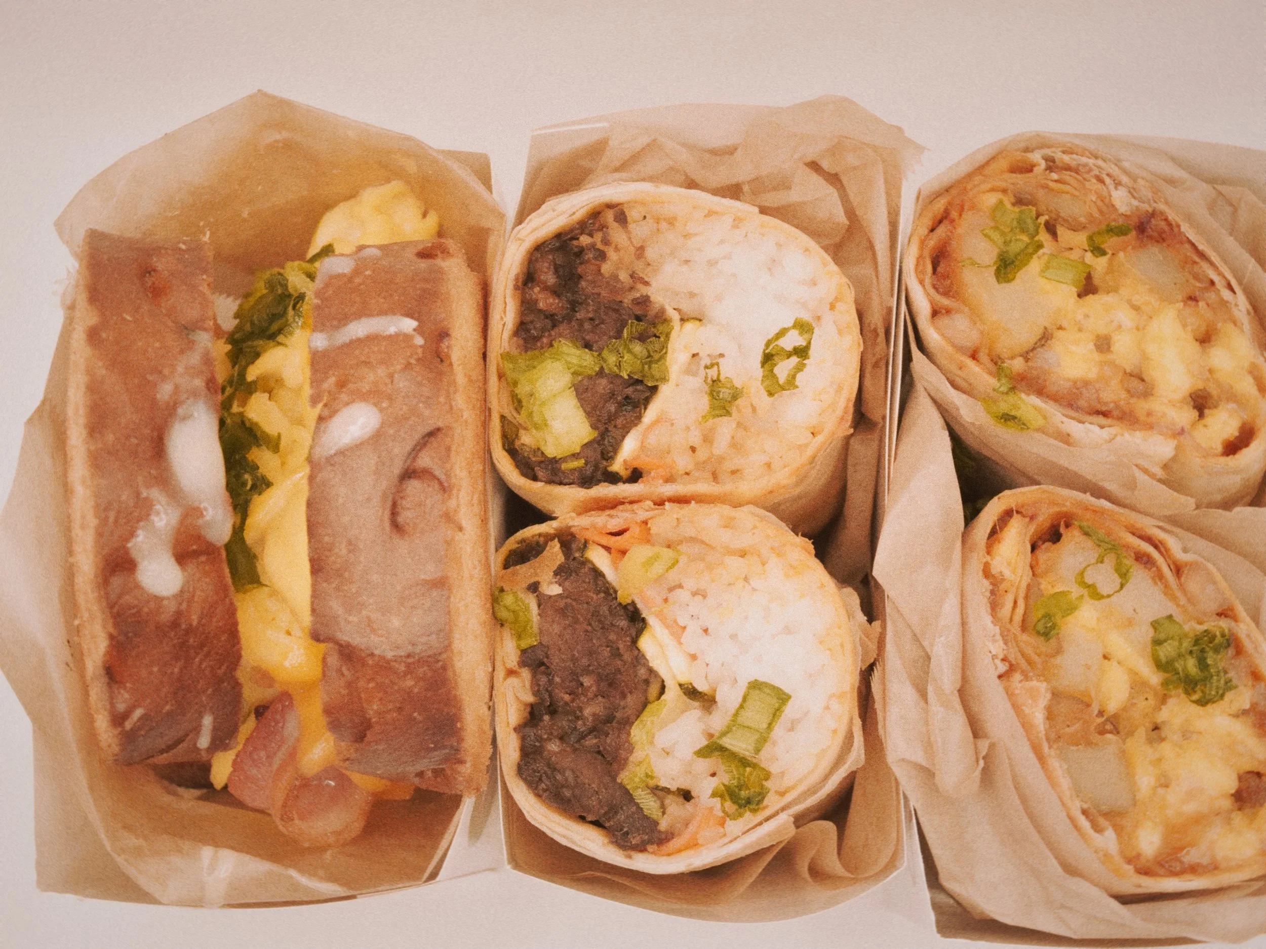 choice of protein - pork belly or bacon - eggs, crispy potatoes, mozzarella cheese drizzled in house Korean sauce wrapped in a tortilla