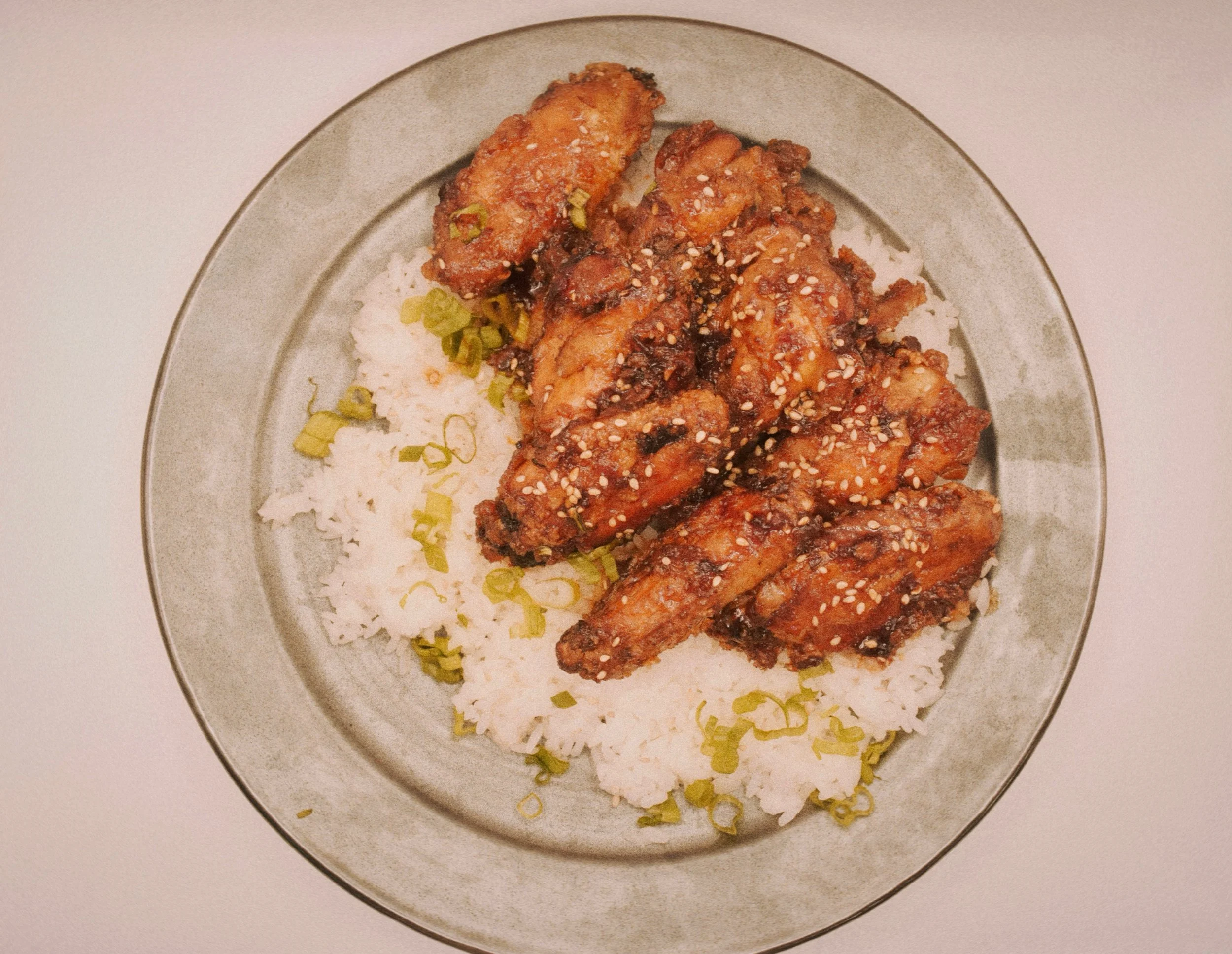cripsy chicken wings with the perfect crunch featuring our Korean glaze, a sweet and spicy gochujang-based sauce. topped with sesame seeds and green onion. served with rice, and banchan [side dishes]